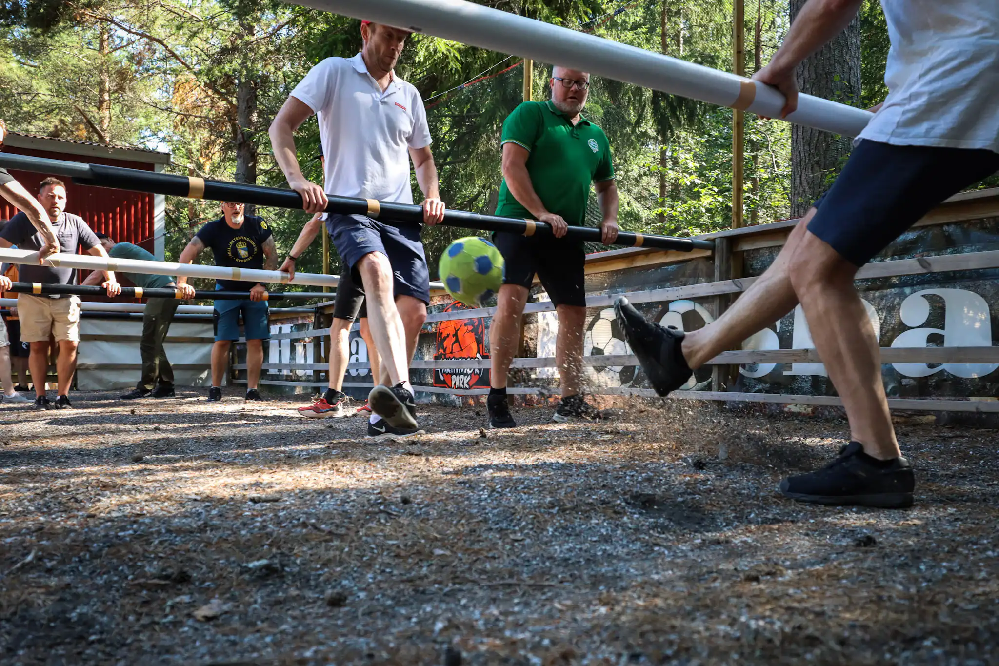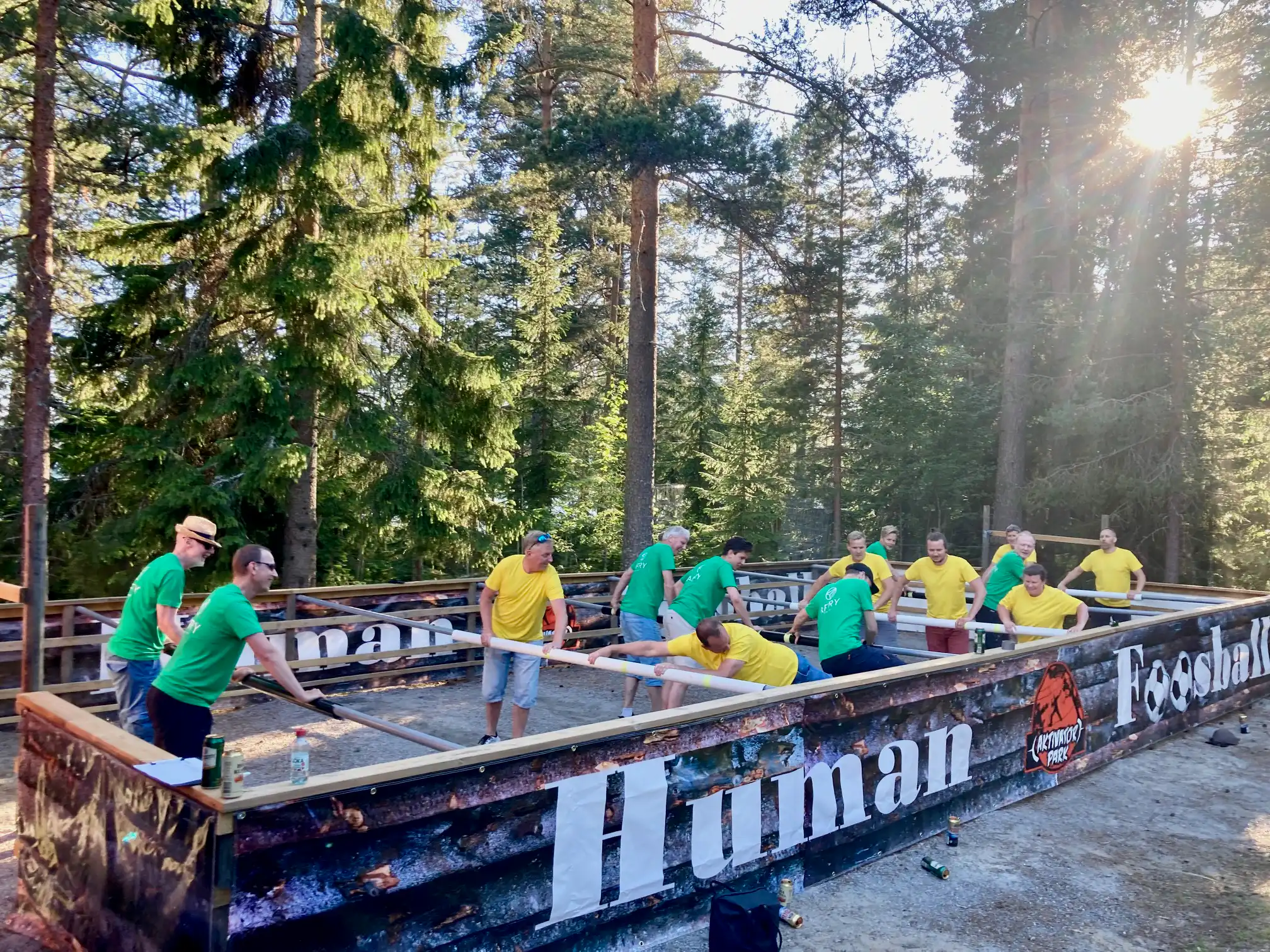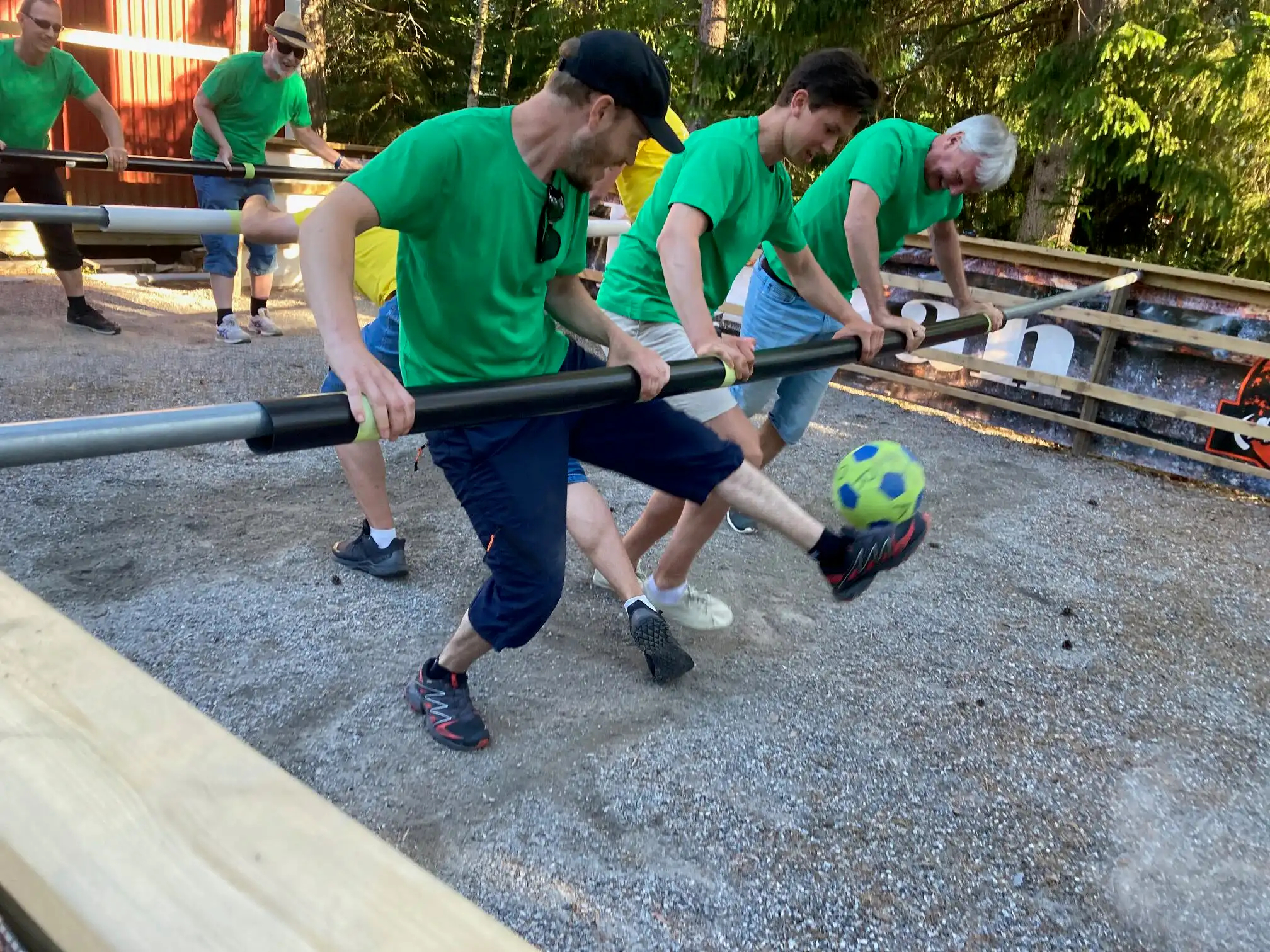 Här har vi byggt upp en gigantisk variant där spelarna sitter fast på de sex långa axlarna. Som spelare kan man endast röra sig i sidled, men bara om man får med sig sina kompisar som sitter fast på samma axel.