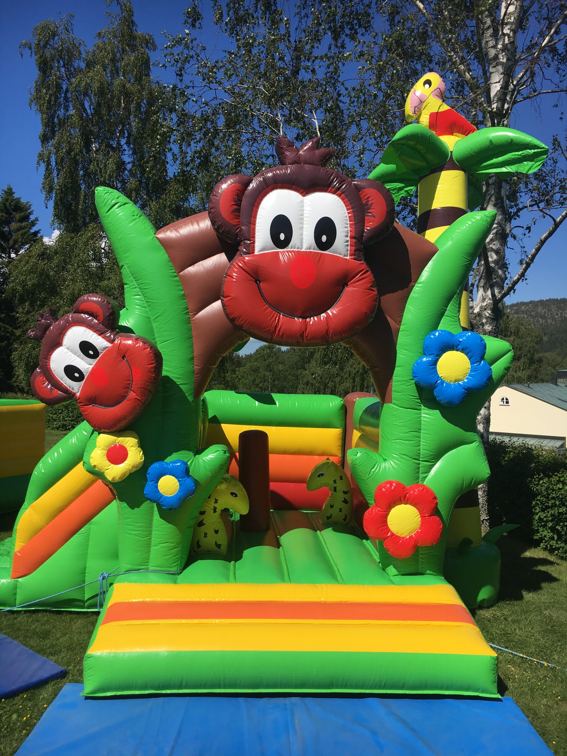 Kul hoppborg med rutschkana, hoppdel och några olika "hinder".