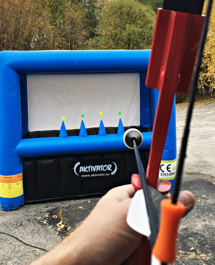 Målen består av svävande bollar, vi skjuter normalt med pilbåge och Archery tag-pilar men det funkar även fint med Nerf, bollkastning mm. Konstruktionen är uppblåsbar och drivs med en liten fläkt. Luften fyller konstruktionen men strömmar även upp i topparna på de blå konerna som gör att bollarna svävar på ett magiskt vis! Fungerar bäst inomhus då bollarna är lite vindkänsliga!