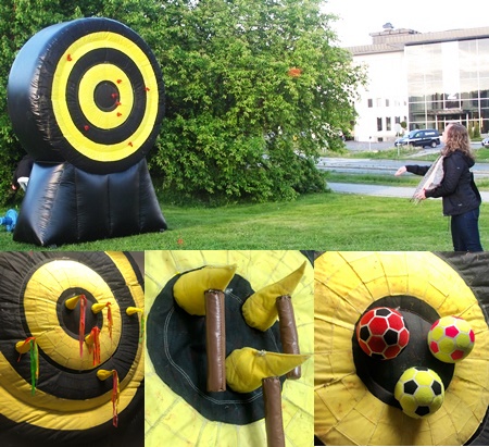 Denna enorma tavla är försedd med kardborre på framsidan så att pilarna, yxorna och fotbollarna fastnar.