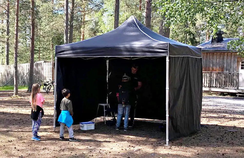Easyup-tält i svart vattenavvisande tyg. stålkonstruktion. 3 väggar utan fönster fästes med kordborrband.